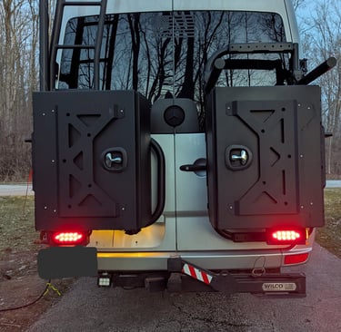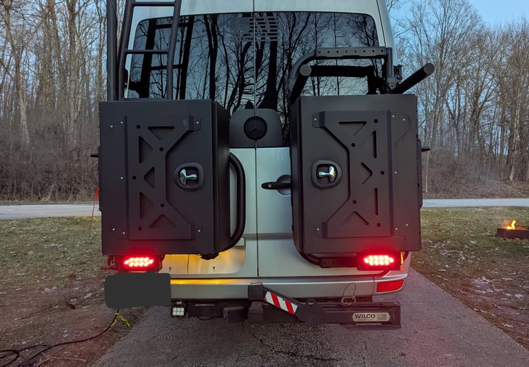 The Sprinters tail lights were partially hidden by the boxes, and even more so by the rotopaX. We love Captain Crunch for breakfast, but not on the highway.