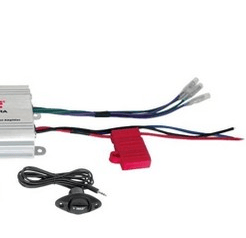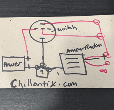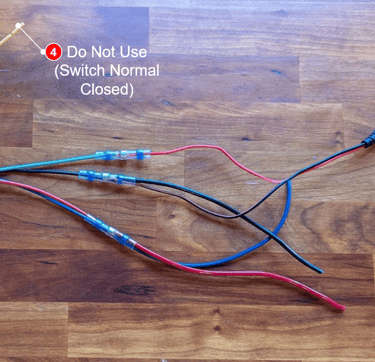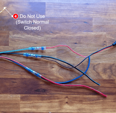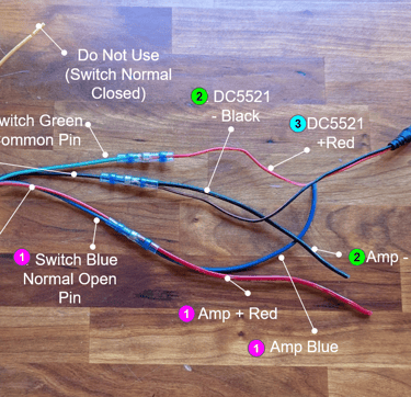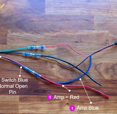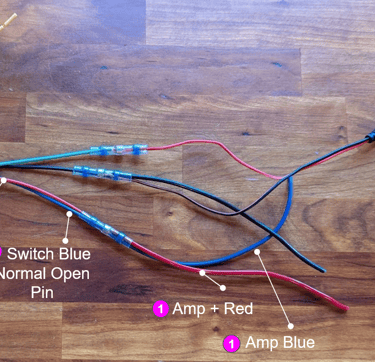 Use a heat shrink butt connector to connect the red & blue from the amp to the red & blue from the switch (Normal Open Pin and LED + Pin). All 4 are connected together as one - don't connect red to red, blue to blue.