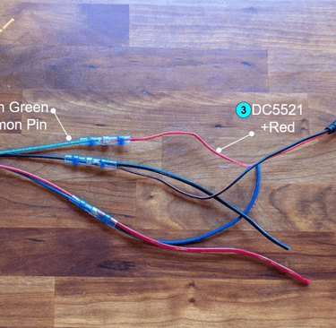 Use a heat shrink butt connector to connect the red from the DC5521 power adapter to the green switch Common pin.