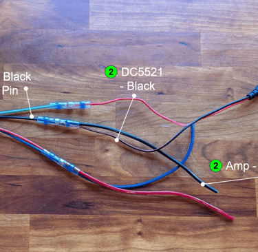 Use a heat shrink butt connector to connect the black from the DC5521 power adapter to the black switch LED - pin and the black - from the amp.