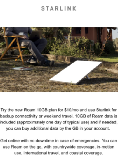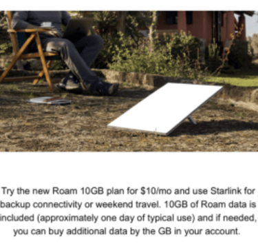 Now you need a plan. Not a trip plan - a Starlink plan my friend. You can see the latest pricing on the ROAM plans below. You're gonna be mobile so need a ROAM plan. The sweet thing is - you only pay for the month you use and can pause until the next adventure. There's no prorating but still a good deal. Here's the coolest part - we were offered a $10 month for 10GB plan if we stopped pausing all the time. 10GB is fine for basic needs and extra GBs are only $2. No more reactivation and having to remember to deactivate after our trips. The offers are always changing so use the google machine to see what available today and fits your needs.
