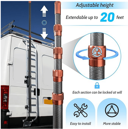 So whats the good word (or three)? Telescoping Flag Pole. Mount this puppy to your ladder, and you can easily hoist your 'link into the heavens. Give it a quick twist to lock in the tilt and you're live on camera 3!